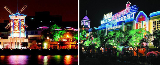 白鹅潭风情酒吧街位于广州市白鹅潭边,全长1600米,拥有一线无敌江景,地理位置得天独厚。白鹅潭酒吧街在充分利用江景资源的理性基础上,结合 “香港兰桂坊”理念,以“酒文化”为灵魂外延,是集休闲、娱乐、办公为一体的商业酒吧街。白鹅潭酒吧街秉承了欧洲古典主义建筑风格,每家酒吧均为2至3层欧陆风格建筑,高塔、钟楼和水塔风车等独特建筑错落有致。风情酒巴街的灯饰也别具一格,每栋房子的色调各有特色,却又和谐统一。依据装修格调、经营特色不同,酒吧街大致有演艺吧、西餐酒廊、清吧几种类型。整条街拥有金公子、双指吧、夜景吧、本色吧、飞帆吧、风车伴酒廊、夜未央、开心吧、威特斯、红树林、绝世好吧、夜未央、赢吧、亚米高、喝采吧、拉菲吧、金锁匙、蓝堡吧等30多个风格各异的酒吧。信步白鹅潭酒吧街,稍不留神,就恍若跌入《呼啸山庄》里的英国古堡、《叶塞尼亚》舞步下的街景、《罗马假日》里的浪漫一隅、《情定巴黎》中的销魂场景等经典电影的情节之中。白鹅潭风情酒吧街被列入广州市十大特色街之一和“珠江夜游”观光上落点,是广州市民乃至“珠江三角洲”地区的消费者休闲、娱乐、旅游的最佳去处,在华南以及港澳地区享有较高的知名度。